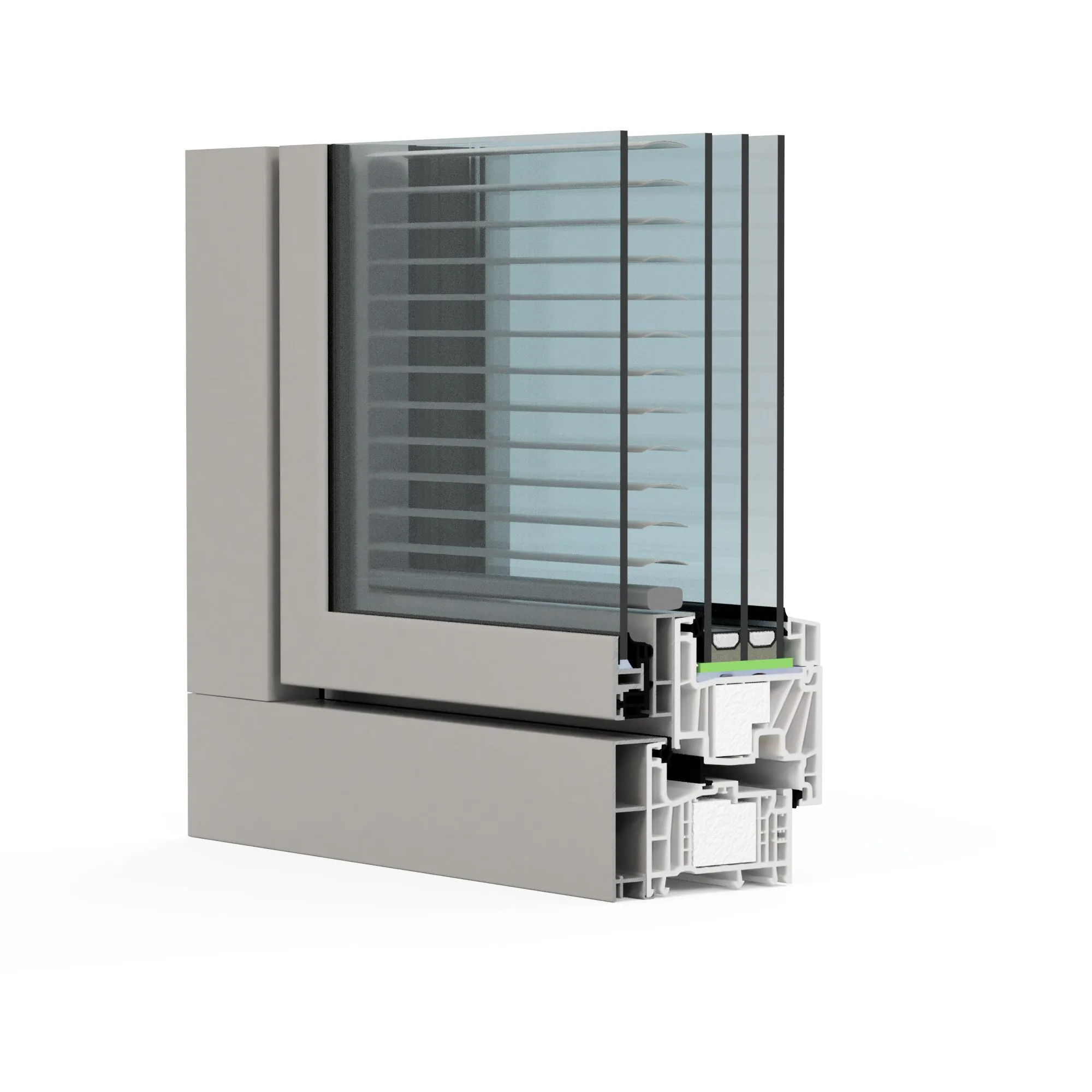 Pomocí otevíratelného přídavného rámečku, uzavřeného čtvrtým sklem, který ke křídlu doléhá pryžovým těsněním, tak vzniká prostor pro stínicí prvek, čímž jsou za prvé ještě vylepšeny tepelně a zvukově izolační vlastnosti, a za druhé je umožněna komfortní údržba nejen okna, ale i žaluzie.