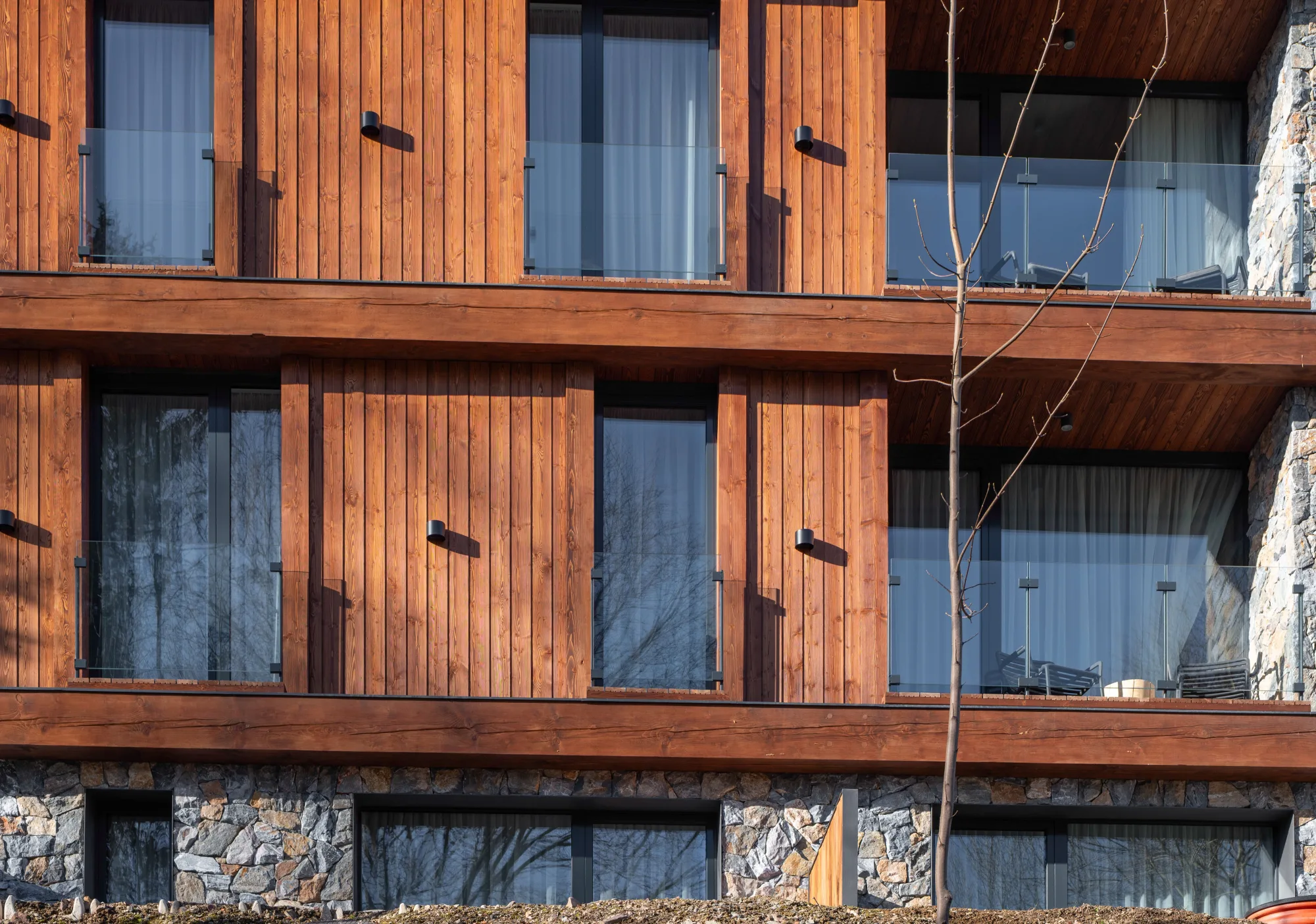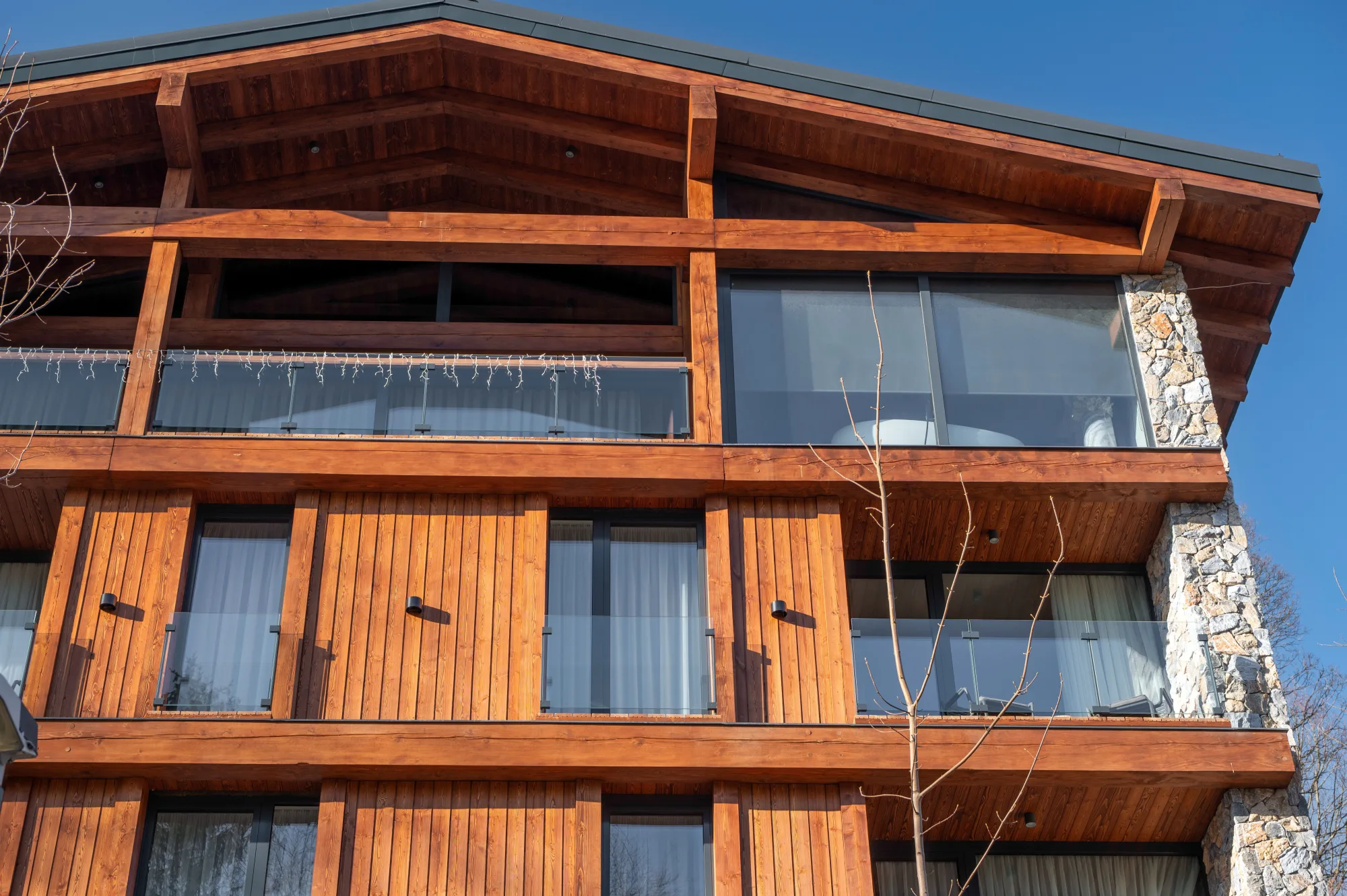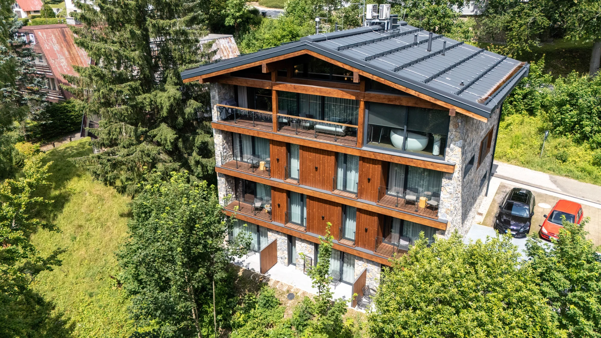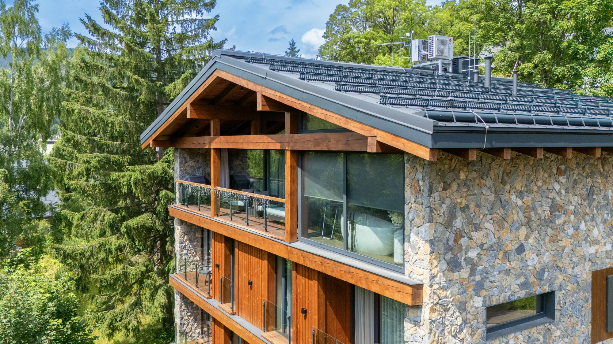 Novostavba horského apartmánového domu s trojkolejnicovým HS portálem a atypickými okny ve štítu