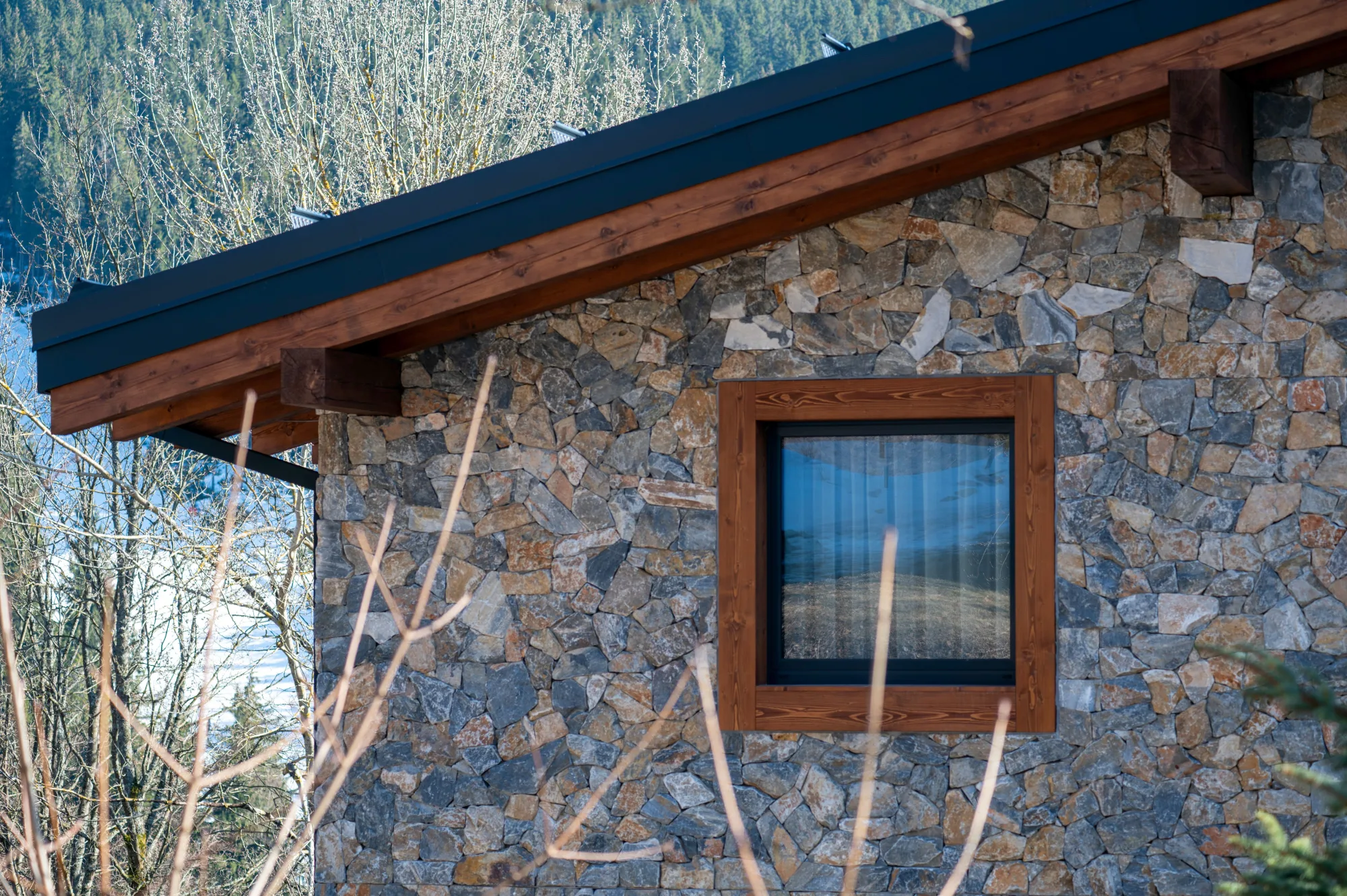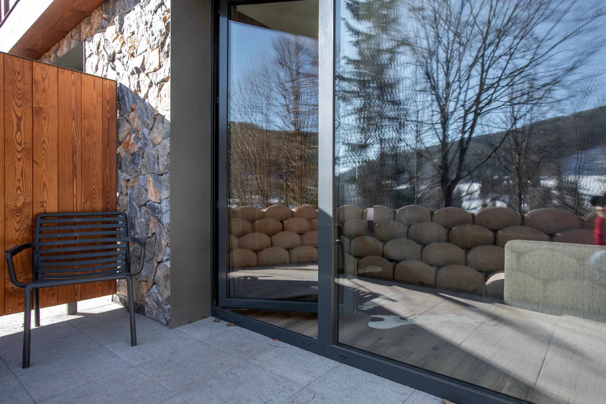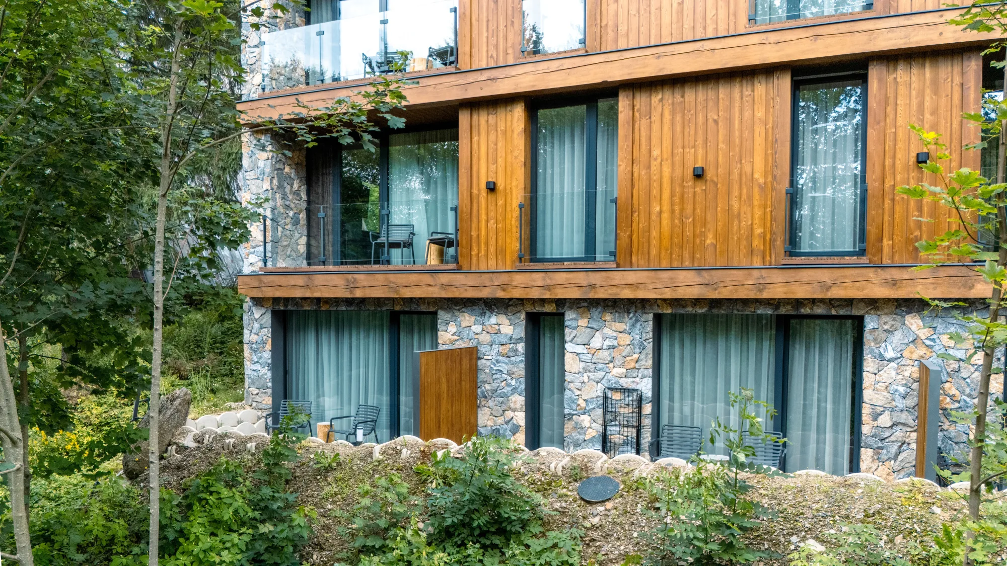 Novostavba horského apartmánového domu s trojkolejnicovým HS portálem a atypickými okny ve štítu