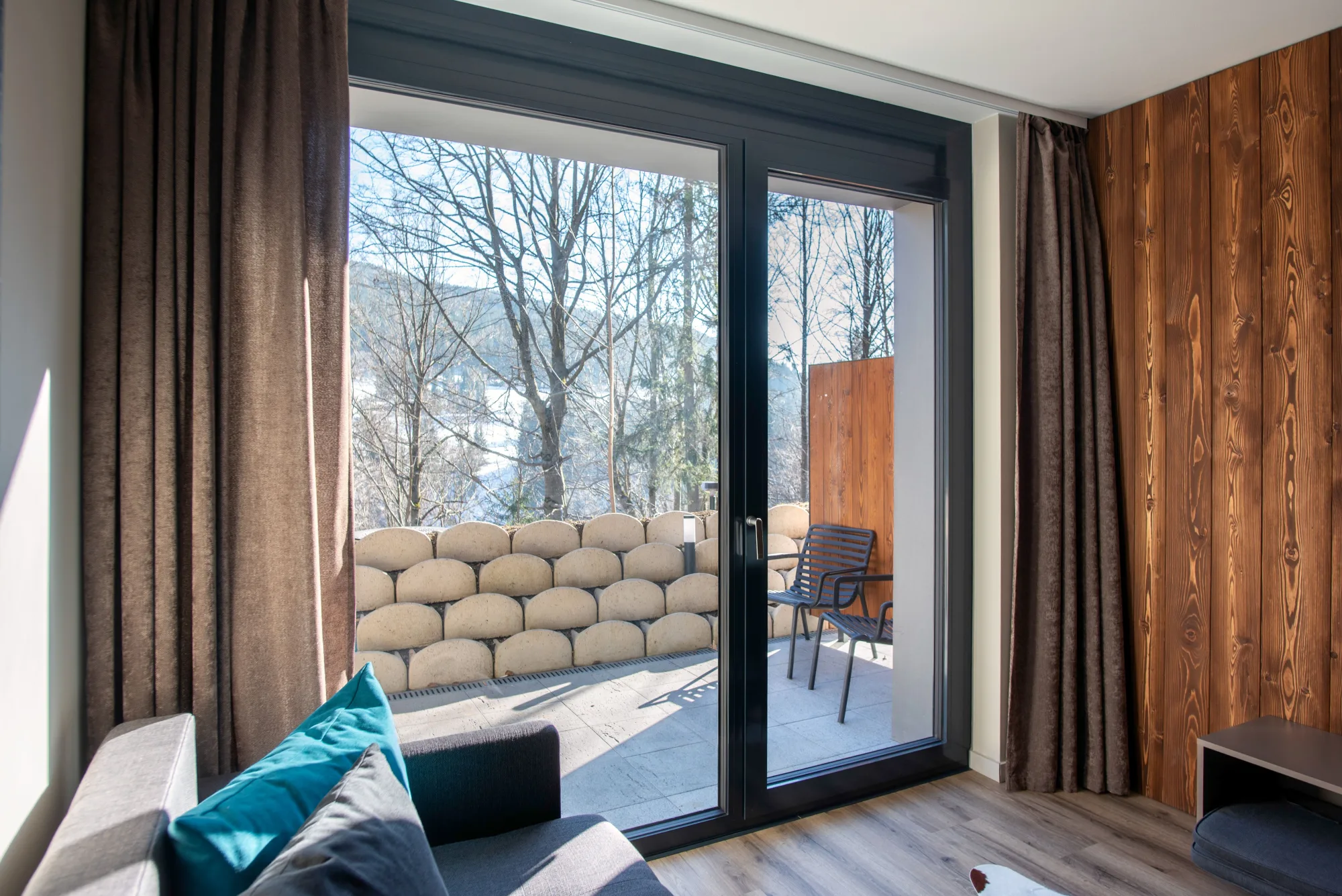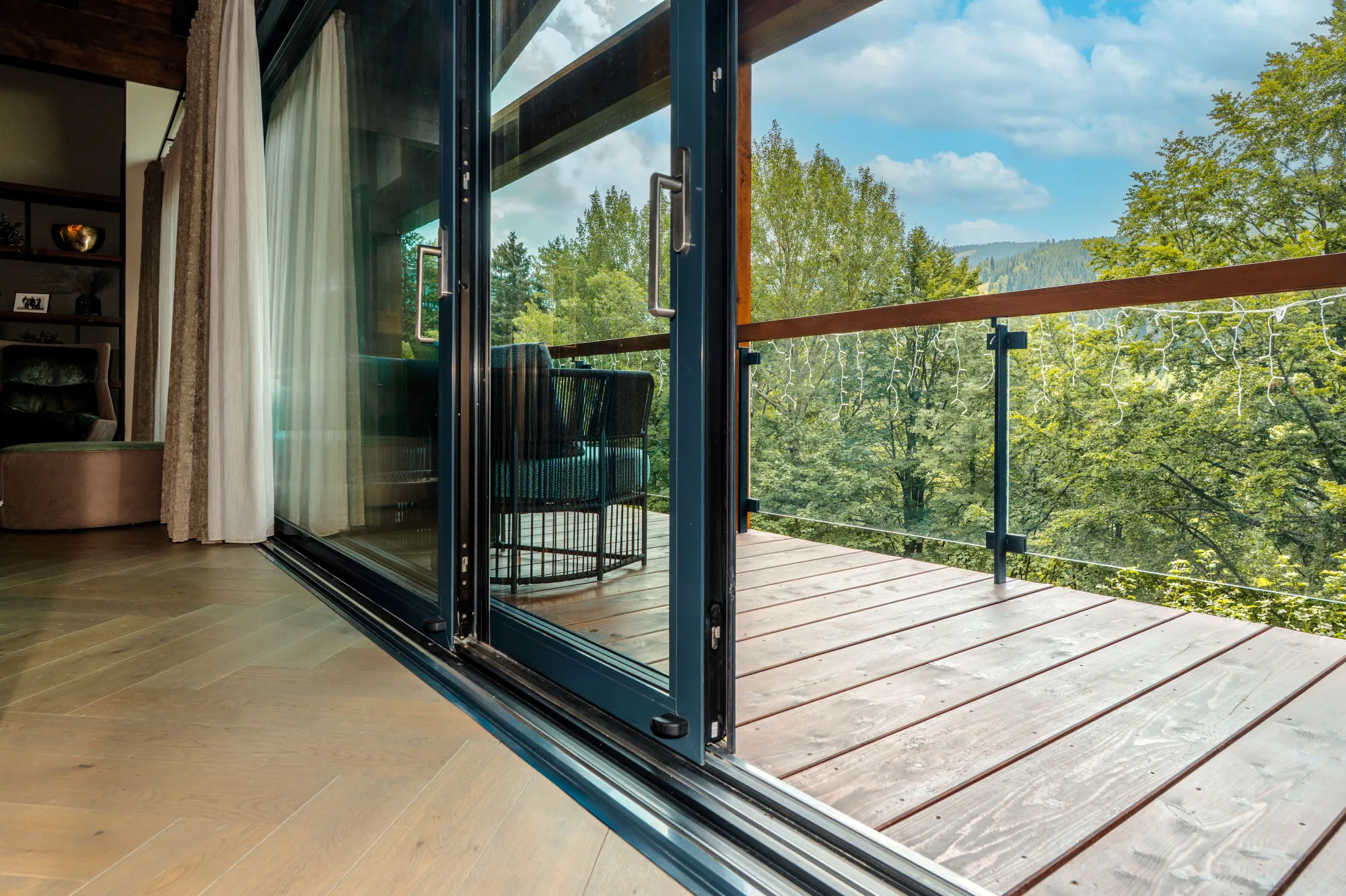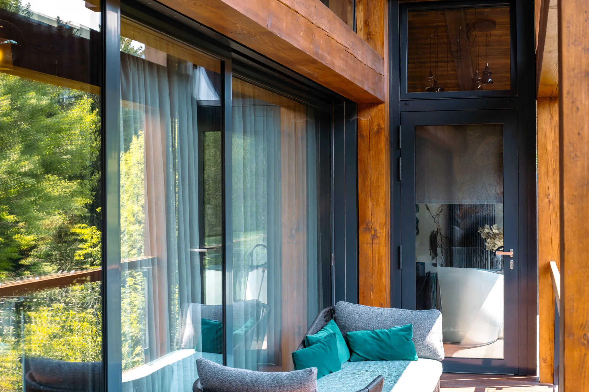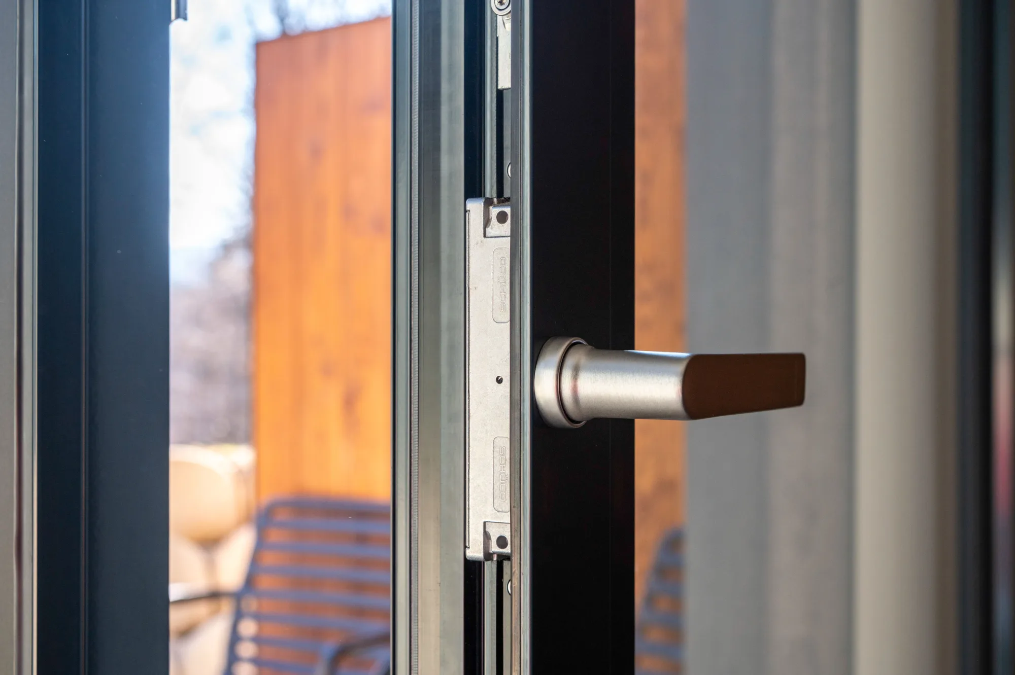 Profily: hliníková okna a balkonové dveře: Schüco AWS/ADS 75.SI+, vchodové dveře: Schüco AD UP 75, zdvižně-posuvné dveře: Schüco ASE 80.HI